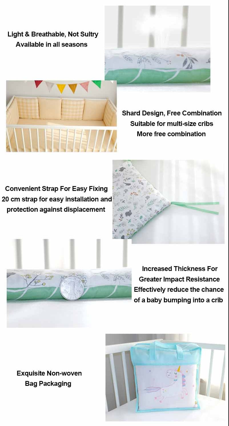 Soft but firm crib bumper is an essential item to ensure baby’s safety and create a cozy nursery environment for them to sleep in. This 100% cotton high-quality cot bumper looks modern yet cozy and sweet. The material is breathable and is perfect for summer! This pattern can easily mix and match with different styles of baby cot sheets, pillowcases, baby bed canopy etc.